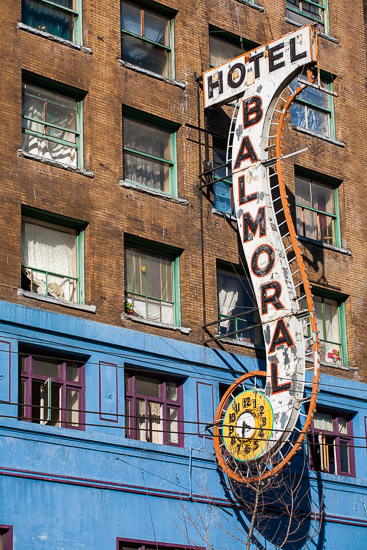 Vancouver, Canada - The Balmoral Hotel neon sign. Located at East Hastings Street and Main Street in the downtown Eastside (DTES) area of Vancouver.